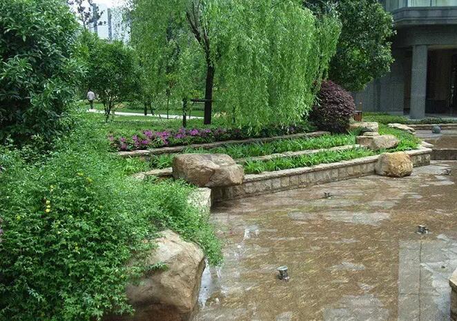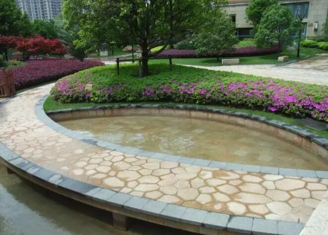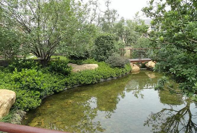 住宅小區(qū)中庭景觀水系,水池周邊親水綠地地被、色塊采用了鳶尾、毛杜鵑、紅花繼木、金森女貞毛球和黃素馨等品種。這與景石有機(jī)結(jié)合,形成形態(tài)自然、葉色、葉形、花色和層次豐富的親水綠地效果。