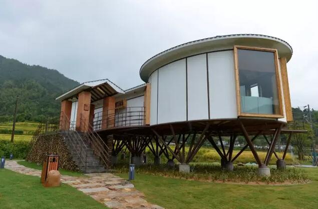 設(shè)計師將一切與自然元素與周邊環(huán)境完完全全相互交織,如屋頂上的青瓷瓦片,支撐建筑的毛竹。從遠處看,就像是一座藏在山腳下的帳篷。