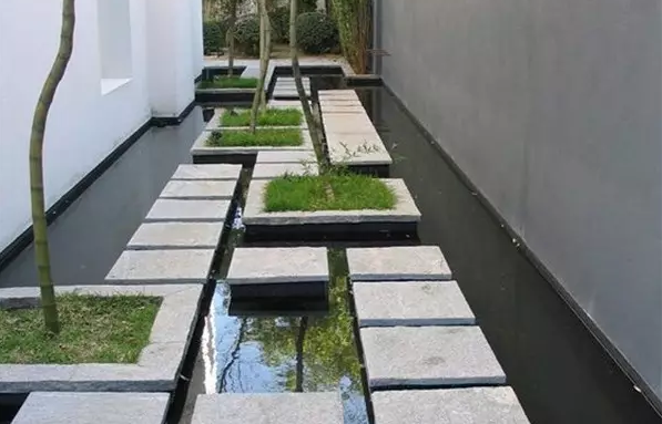 汀步是步石的一種類型,設置在水上。在淺水中按一定間距布設塊石,微露水面,讓人跨步而過。園林中運用這種古老的渡水設施,質樸自然,別有情趣。這種路面具有簡易、造價低、鋪裝靈活、適應性強、富于情趣的特點。