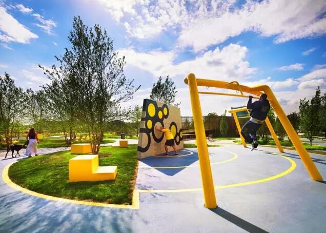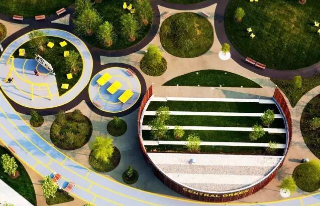 費(fèi)城海軍造船廠中心5英畝的綠色空間是由James Corner Field Operations設(shè)計(jì)的。這里曾經(jīng)是一個(gè)封閉的軍事設(shè)施場地,如今卻成為該地區(qū)最先進(jìn)、最充滿活力的商業(yè)地點(diǎn)和中心公園。設(shè)計(jì)結(jié)合場地的原始生境和尖端城市潛力,打造出一個(gè)新型的可持續(xù)、綠色、自然、活躍和城市化的環(huán)境。該公園的設(shè)計(jì)特色是運(yùn)用了一連串綠色的圓形,這樣的圓形設(shè)計(jì)來自于大自然。圓形的公園看似是一個(gè)整體,實(shí)際上擁有多個(gè)獨(dú)立的空間。這里有許多創(chuàng)意空間,包括健身站、露天劇場“陽光草坪”、吊床林、球場、乒乓球桌、公共工作臺(tái)、雨水收集裝置等。場地將活躍的娛樂游戲與安靜的聚會(huì)場所實(shí)現(xiàn)了很好的平衡。例如,X型的長桌用于野餐和會(huì)議,附近黃色的吊床和樹木則形成安靜的休息空間。