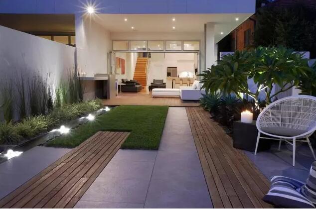 在原來一片空白的后院里創(chuàng)造了一個綠色庭院空間,出口以木平臺延伸室內空間,緊靠圍墻設計了一個洗手臺;后院以木材、石材、草和水景為基本元素,花園端頭形成一個小小的室外平臺